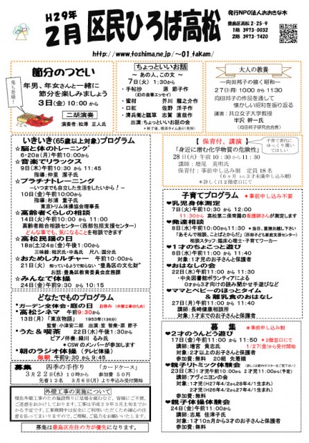 【 12月 】 ■ [要町三丁目町会] 古紙回収 日時:12月21日(日) 9時30分~ 各戸玄関前まで回収に伺います 【 1月 】 ■ 第17回 ふるさと千川どんど焼き 日時:1月11日(日) 10時00分~12時00分 会場:ふるさと千川ひろば 獅子舞ほか伝統芸能、芋のこ汁、おしるこ ■ [要町三丁目町会] 古紙回収 日時:1月25日(日) 9時30分~ 各戸玄関前まで回収に伺います