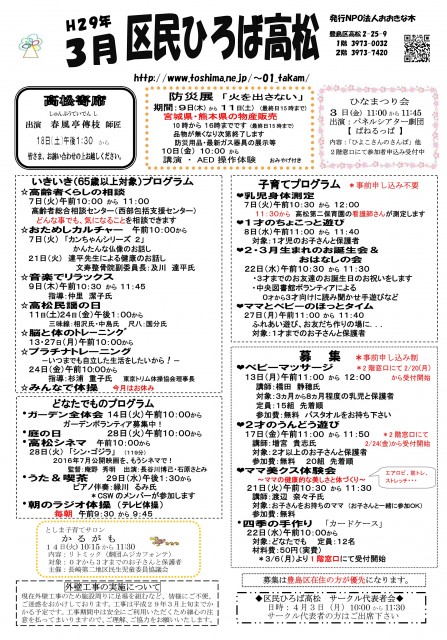 【 12月 】 ■ [要町三丁目町会] 古紙回収 日時:12月21日(日) 9時30分~ 各戸玄関前まで回収に伺います 【 1月 】 ■ 第17回 ふるさと千川どんど焼き 日時:1月11日(日) 10時00分~12時00分 会場:ふるさと千川ひろば 獅子舞ほか伝統芸能、芋のこ汁、おしるこ ■ [要町三丁目町会] 古紙回収 日時:1月25日(日) 9時30分~ 各戸玄関前まで回収に伺います