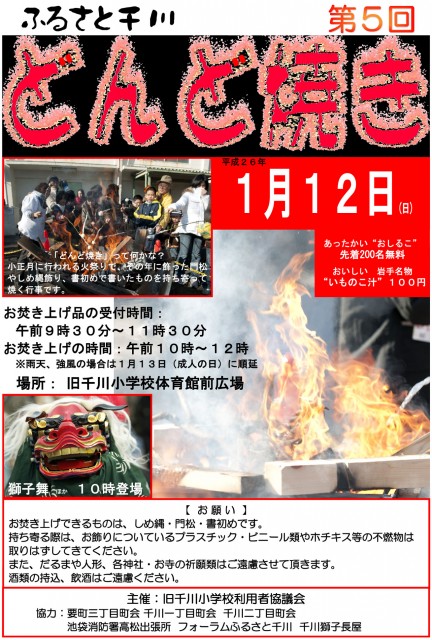 【 12月 】 ■ [要町三丁目町会] 古紙回収 日時:12月21日(日) 9時30分~ 各戸玄関前まで回収に伺います 【 1月 】 ■ 第17回 ふるさと千川どんど焼き 日時:1月11日(日) 10時00分~12時00分 会場:ふるさと千川ひろば 獅子舞ほか伝統芸能、芋のこ汁、おしるこ ■ [要町三丁目町会] 古紙回収 日時:1月25日(日) 9時30分~ 各戸玄関前まで回収に伺います