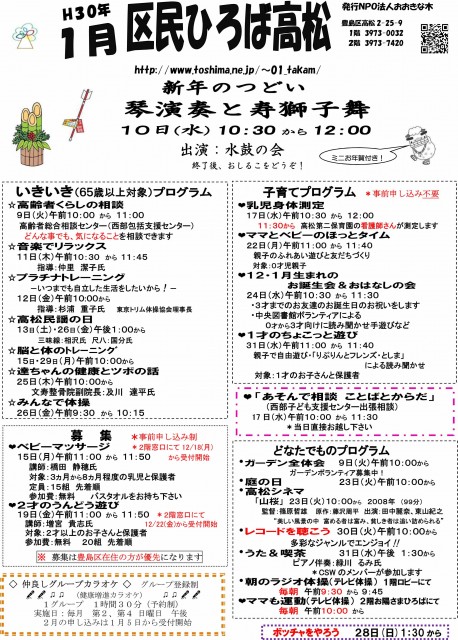【 12月 】 ■ [要町三丁目町会] 古紙回収 日時:12月21日(日) 9時30分~ 各戸玄関前まで回収に伺います 【 1月 】 ■ 第17回 ふるさと千川どんど焼き 日時:1月11日(日) 10時00分~12時00分 会場:ふるさと千川ひろば 獅子舞ほか伝統芸能、芋のこ汁、おしるこ ■ [要町三丁目町会] 古紙回収 日時:1月25日(日) 9時30分~ 各戸玄関前まで回収に伺います