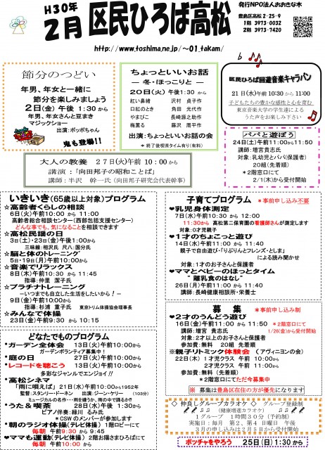 【 12月 】 ■ [要町三丁目町会] 古紙回収 日時:12月21日(日) 9時30分~ 各戸玄関前まで回収に伺います 【 1月 】 ■ 第17回 ふるさと千川どんど焼き 日時:1月11日(日) 10時00分~12時00分 会場:ふるさと千川ひろば 獅子舞ほか伝統芸能、芋のこ汁、おしるこ ■ [要町三丁目町会] 古紙回収 日時:1月25日(日) 9時30分~ 各戸玄関前まで回収に伺います