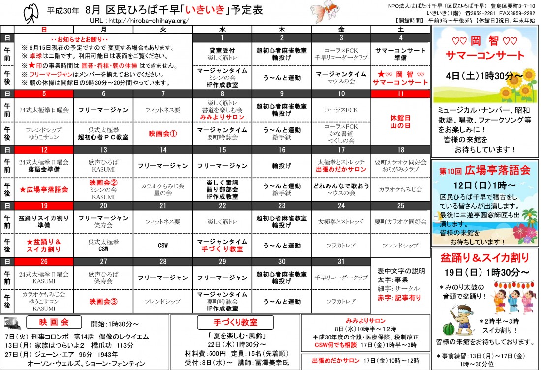 【 12月 】 ■ [要町三丁目町会] 古紙回収 日時:12月21日(日) 9時30分~ 各戸玄関前まで回収に伺います 【 1月 】 ■ 第17回 ふるさと千川どんど焼き 日時:1月11日(日) 10時00分~12時00分 会場:ふるさと千川ひろば 獅子舞ほか伝統芸能、芋のこ汁、おしるこ ■ [要町三丁目町会] 古紙回収 日時:1月25日(日) 9時30分~ 各戸玄関前まで回収に伺います