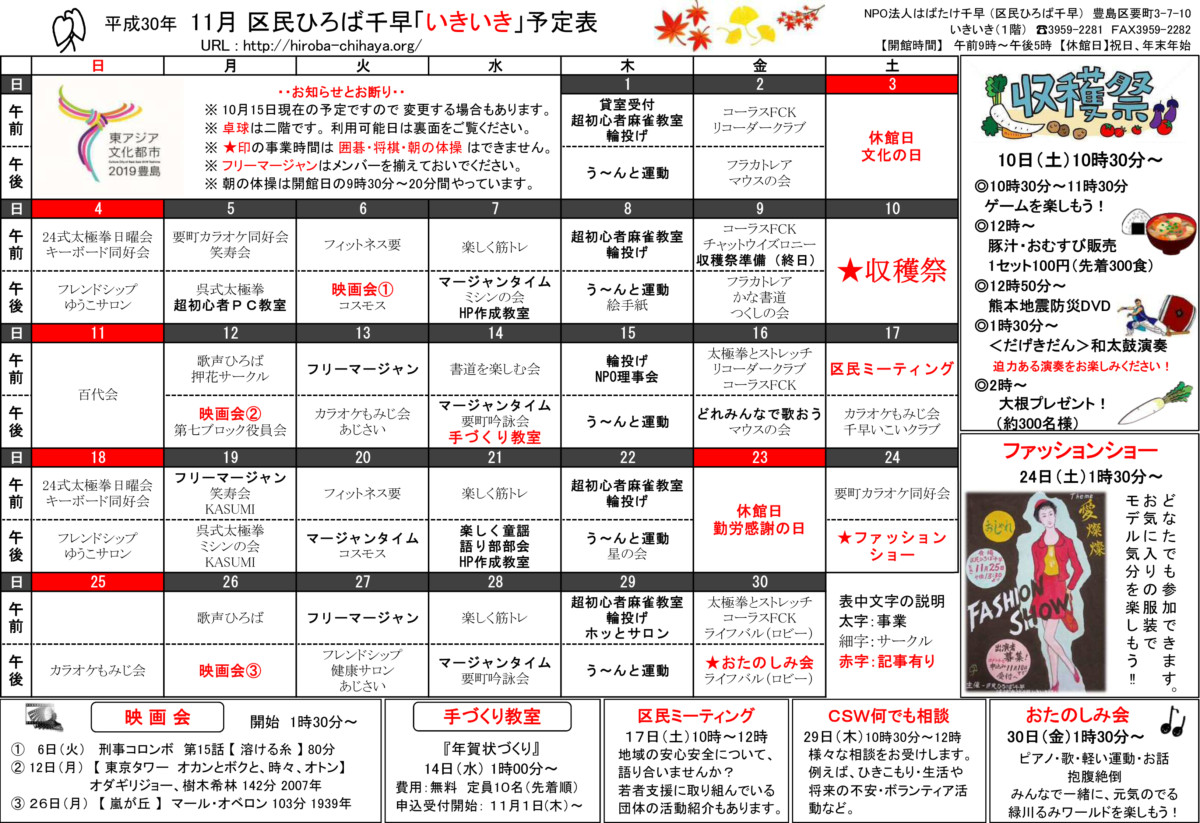 【 12月 】 ■ [要町三丁目町会] 古紙回収 日時:12月21日(日) 9時30分~ 各戸玄関前まで回収に伺います 【 1月 】 ■ 第17回 ふるさと千川どんど焼き 日時:1月11日(日) 10時00分~12時00分 会場:ふるさと千川ひろば 獅子舞ほか伝統芸能、芋のこ汁、おしるこ ■ [要町三丁目町会] 古紙回収 日時:1月25日(日) 9時30分~ 各戸玄関前まで回収に伺います