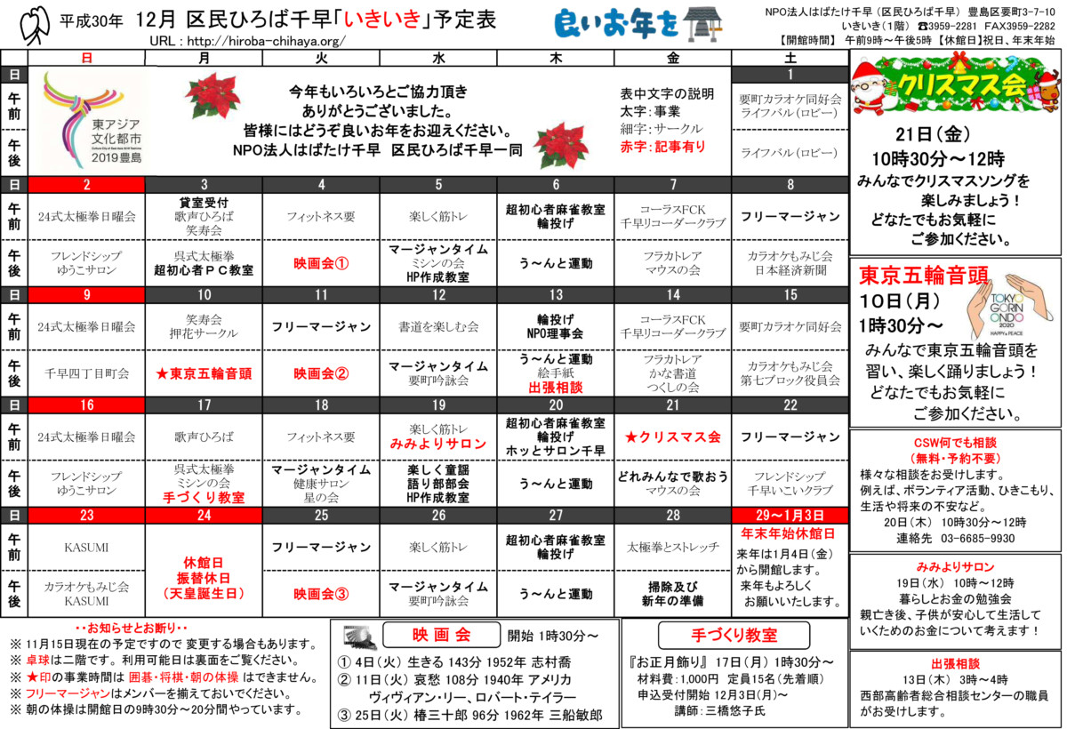 【 12月 】 ■ [要町三丁目町会] 古紙回収 日時:12月21日(日) 9時30分~ 各戸玄関前まで回収に伺います 【 1月 】 ■ 第17回 ふるさと千川どんど焼き 日時:1月11日(日) 10時00分~12時00分 会場:ふるさと千川ひろば 獅子舞ほか伝統芸能、芋のこ汁、おしるこ ■ [要町三丁目町会] 古紙回収 日時:1月25日(日) 9時30分~ 各戸玄関前まで回収に伺います