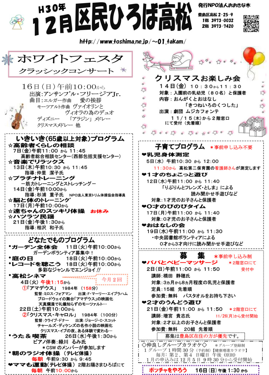 【 12月 】 ■ [要町三丁目町会] 古紙回収 日時:12月21日(日) 9時30分~ 各戸玄関前まで回収に伺います 【 1月 】 ■ 第17回 ふるさと千川どんど焼き 日時:1月11日(日) 10時00分~12時00分 会場:ふるさと千川ひろば 獅子舞ほか伝統芸能、芋のこ汁、おしるこ ■ [要町三丁目町会] 古紙回収 日時:1月25日(日) 9時30分~ 各戸玄関前まで回収に伺います
