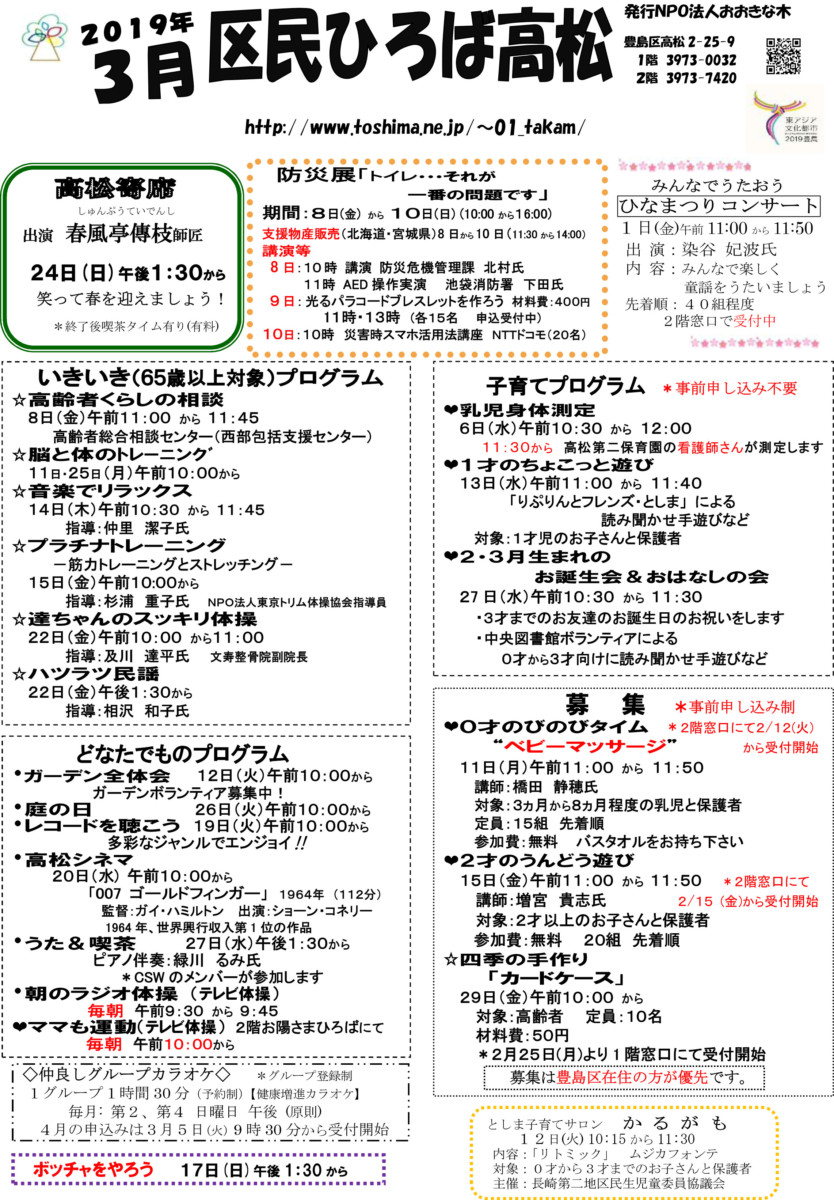 【 12月 】 ■ [要町三丁目町会] 古紙回収 日時:12月21日(日) 9時30分~ 各戸玄関前まで回収に伺います 【 1月 】 ■ 第17回 ふるさと千川どんど焼き 日時:1月11日(日) 10時00分~12時00分 会場:ふるさと千川ひろば 獅子舞ほか伝統芸能、芋のこ汁、おしるこ ■ [要町三丁目町会] 古紙回収 日時:1月25日(日) 9時30分~ 各戸玄関前まで回収に伺います