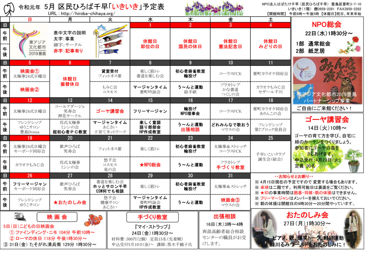 【 12月 】 ■ [要町三丁目町会] 古紙回収 日時:12月21日(日) 9時30分~ 各戸玄関前まで回収に伺います 【 1月 】 ■ 第17回 ふるさと千川どんど焼き 日時:1月11日(日) 10時00分~12時00分 会場:ふるさと千川ひろば 獅子舞ほか伝統芸能、芋のこ汁、おしるこ ■ [要町三丁目町会] 古紙回収 日時:1月25日(日) 9時30分~ 各戸玄関前まで回収に伺います
