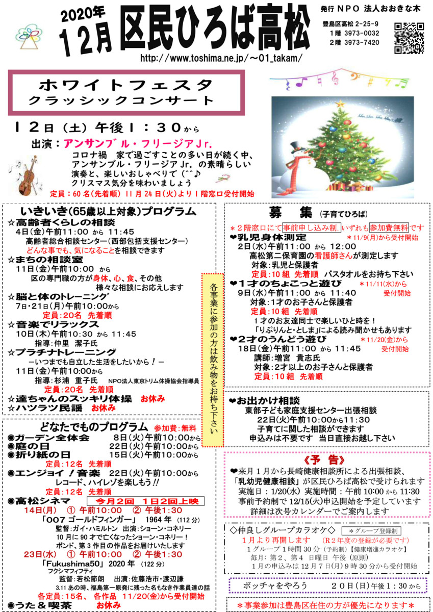 【 12月 】 ■ [要町三丁目町会] 古紙回収 日時:12月21日(日) 9時30分~ 各戸玄関前まで回収に伺います 【 1月 】 ■ 第17回 ふるさと千川どんど焼き 日時:1月11日(日) 10時00分~12時00分 会場:ふるさと千川ひろば 獅子舞ほか伝統芸能、芋のこ汁、おしるこ ■ [要町三丁目町会] 古紙回収 日時:1月25日(日) 9時30分~ 各戸玄関前まで回収に伺います