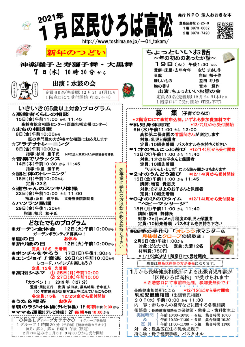 【 12月 】 ■ [要町三丁目町会] 古紙回収 日時:12月21日(日) 9時30分~ 各戸玄関前まで回収に伺います 【 1月 】 ■ 第17回 ふるさと千川どんど焼き 日時:1月11日(日) 10時00分~12時00分 会場:ふるさと千川ひろば 獅子舞ほか伝統芸能、芋のこ汁、おしるこ ■ [要町三丁目町会] 古紙回収 日時:1月25日(日) 9時30分~ 各戸玄関前まで回収に伺います