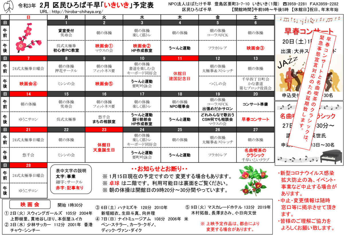 【 12月 】 ■ [要町三丁目町会] 古紙回収 日時:12月21日(日) 9時30分~ 各戸玄関前まで回収に伺います 【 1月 】 ■ 第17回 ふるさと千川どんど焼き 日時:1月11日(日) 10時00分~12時00分 会場:ふるさと千川ひろば 獅子舞ほか伝統芸能、芋のこ汁、おしるこ ■ [要町三丁目町会] 古紙回収 日時:1月25日(日) 9時30分~ 各戸玄関前まで回収に伺います