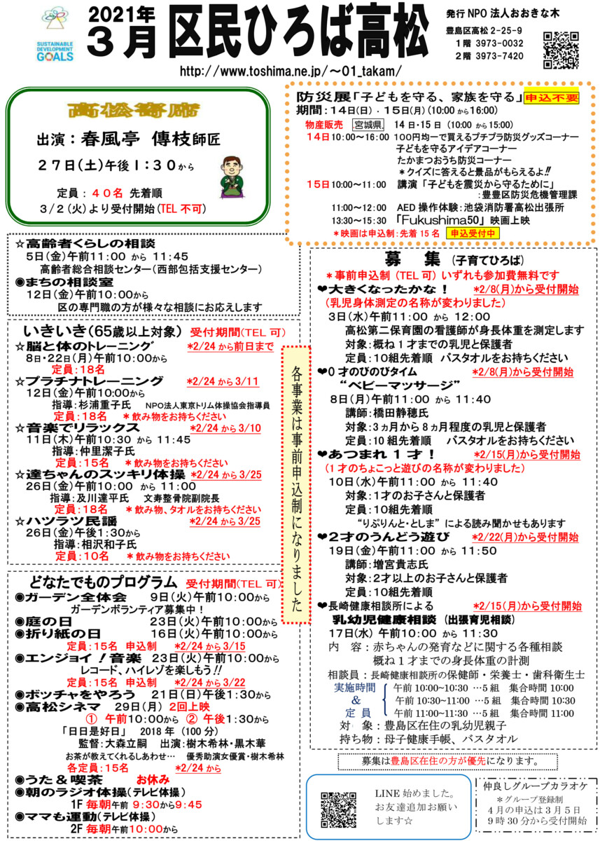【 12月 】 ■ [要町三丁目町会] 古紙回収 日時:12月21日(日) 9時30分~ 各戸玄関前まで回収に伺います 【 1月 】 ■ 第17回 ふるさと千川どんど焼き 日時:1月11日(日) 10時00分~12時00分 会場:ふるさと千川ひろば 獅子舞ほか伝統芸能、芋のこ汁、おしるこ ■ [要町三丁目町会] 古紙回収 日時:1月25日(日) 9時30分~ 各戸玄関前まで回収に伺います