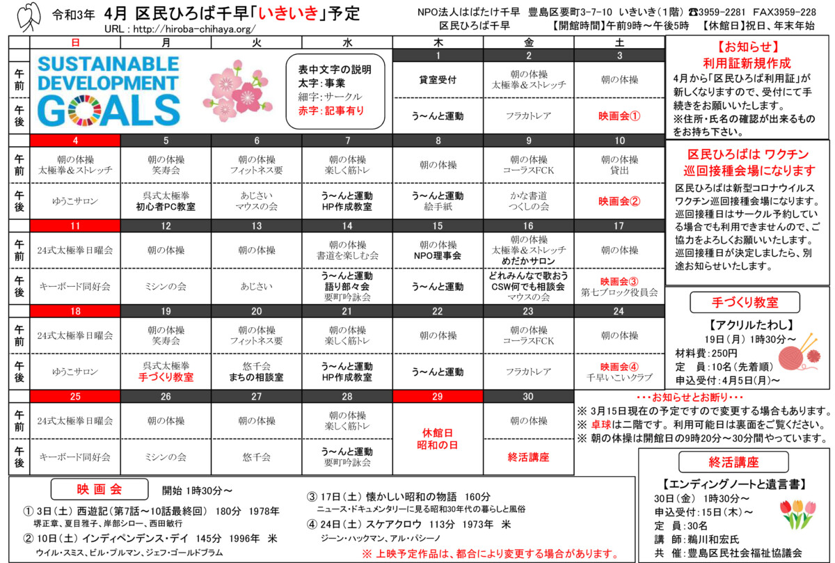 【 12月 】 ■ [要町三丁目町会] 古紙回収 日時:12月21日(日) 9時30分~ 各戸玄関前まで回収に伺います 【 1月 】 ■ 第17回 ふるさと千川どんど焼き 日時:1月11日(日) 10時00分~12時00分 会場:ふるさと千川ひろば 獅子舞ほか伝統芸能、芋のこ汁、おしるこ ■ [要町三丁目町会] 古紙回収 日時:1月25日(日) 9時30分~ 各戸玄関前まで回収に伺います