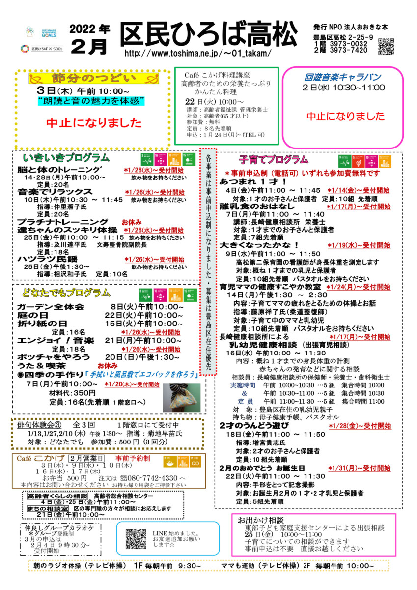 【 12月 】 ■ [要町三丁目町会] 古紙回収 日時:12月21日(日) 9時30分~ 各戸玄関前まで回収に伺います 【 1月 】 ■ 第17回 ふるさと千川どんど焼き 日時:1月11日(日) 10時00分~12時00分 会場:ふるさと千川ひろば 獅子舞ほか伝統芸能、芋のこ汁、おしるこ ■ [要町三丁目町会] 古紙回収 日時:1月25日(日) 9時30分~ 各戸玄関前まで回収に伺います