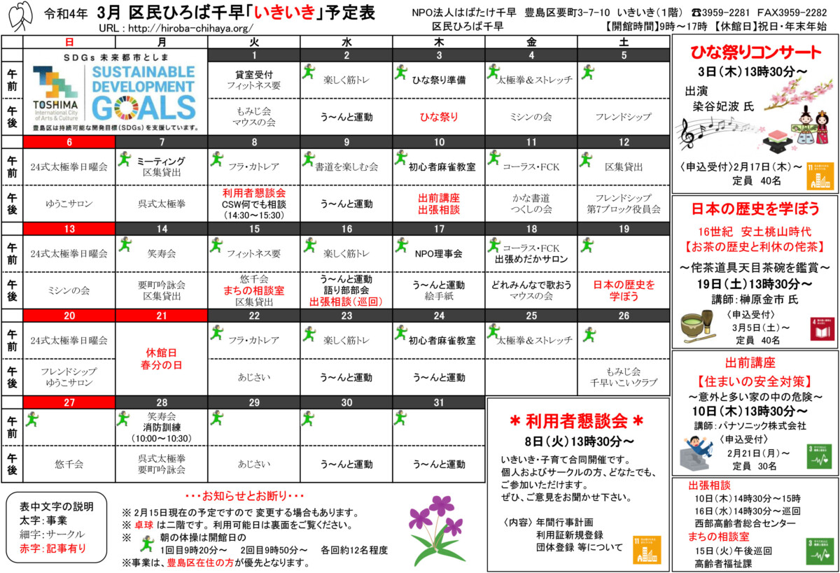 【 12月 】 ■ [要町三丁目町会] 古紙回収 日時:12月21日(日) 9時30分~ 各戸玄関前まで回収に伺います 【 1月 】 ■ 第17回 ふるさと千川どんど焼き 日時:1月11日(日) 10時00分~12時00分 会場:ふるさと千川ひろば 獅子舞ほか伝統芸能、芋のこ汁、おしるこ ■ [要町三丁目町会] 古紙回収 日時:1月25日(日) 9時30分~ 各戸玄関前まで回収に伺います