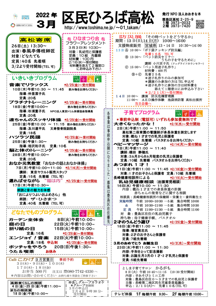 【 12月 】 ■ [要町三丁目町会] 古紙回収 日時:12月21日(日) 9時30分~ 各戸玄関前まで回収に伺います 【 1月 】 ■ 第17回 ふるさと千川どんど焼き 日時:1月11日(日) 10時00分~12時00分 会場:ふるさと千川ひろば 獅子舞ほか伝統芸能、芋のこ汁、おしるこ ■ [要町三丁目町会] 古紙回収 日時:1月25日(日) 9時30分~ 各戸玄関前まで回収に伺います