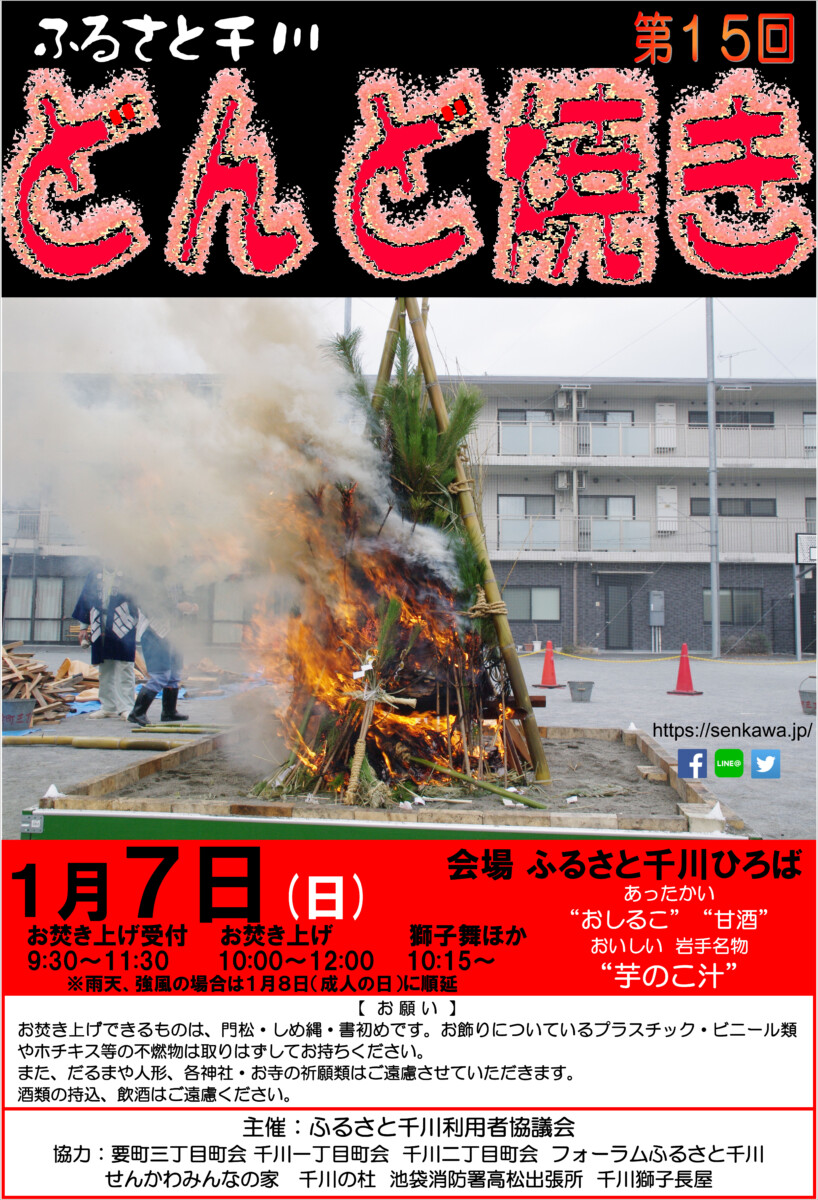 【 12月 】 ■ [要町三丁目町会] 古紙回収 日時:12月21日(日) 9時30分~ 各戸玄関前まで回収に伺います 【 1月 】 ■ 第17回 ふるさと千川どんど焼き 日時:1月11日(日) 10時00分~12時00分 会場:ふるさと千川ひろば 獅子舞ほか伝統芸能、芋のこ汁、おしるこ ■ [要町三丁目町会] 古紙回収 日時:1月25日(日) 9時30分~ 各戸玄関前まで回収に伺います