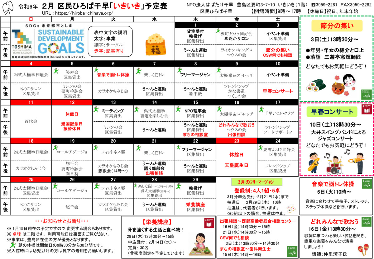 【 12月 】 ■ [要町三丁目町会] 古紙回収 日時:12月21日(日) 9時30分~ 各戸玄関前まで回収に伺います 【 1月 】 ■ 第17回 ふるさと千川どんど焼き 日時:1月11日(日) 10時00分~12時00分 会場:ふるさと千川ひろば 獅子舞ほか伝統芸能、芋のこ汁、おしるこ ■ [要町三丁目町会] 古紙回収 日時:1月25日(日) 9時30分~ 各戸玄関前まで回収に伺います