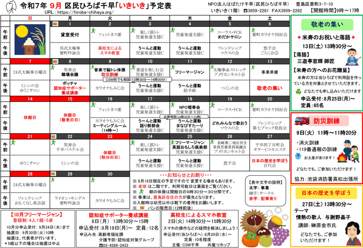 【 12月 】 ■ [要町三丁目町会] 古紙回収 日時:12月21日(日) 9時30分~ 各戸玄関前まで回収に伺います 【 1月 】 ■ 第17回 ふるさと千川どんど焼き 日時:1月11日(日) 10時00分~12時00分 会場:ふるさと千川ひろば 獅子舞ほか伝統芸能、芋のこ汁、おしるこ ■ [要町三丁目町会] 古紙回収 日時:1月25日(日) 9時30分~ 各戸玄関前まで回収に伺います