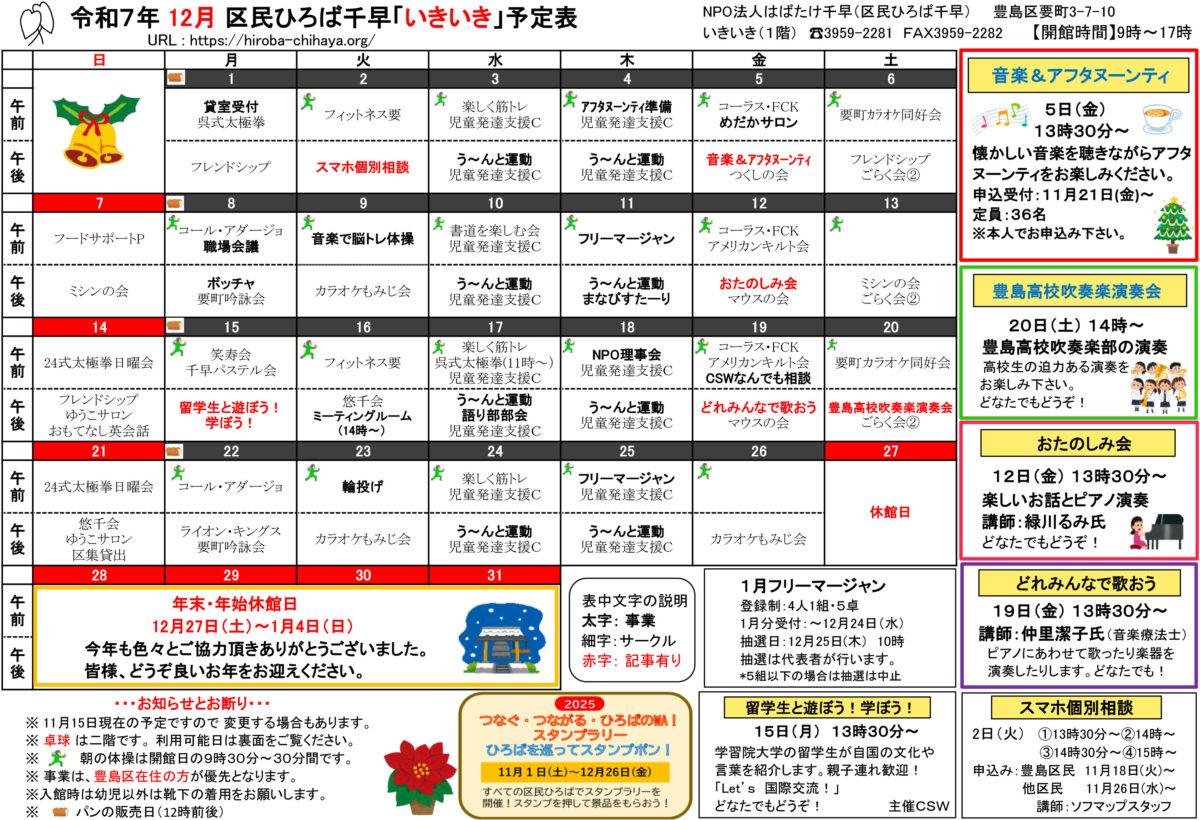【 12月 】 ■ [要町三丁目町会] 古紙回収 日時:12月21日(日) 9時30分~ 各戸玄関前まで回収に伺います 【 1月 】 ■ 第17回 ふるさと千川どんど焼き 日時:1月11日(日) 10時00分~12時00分 会場:ふるさと千川ひろば 獅子舞ほか伝統芸能、芋のこ汁、おしるこ ■ [要町三丁目町会] 古紙回収 日時:1月25日(日) 9時30分~ 各戸玄関前まで回収に伺います
