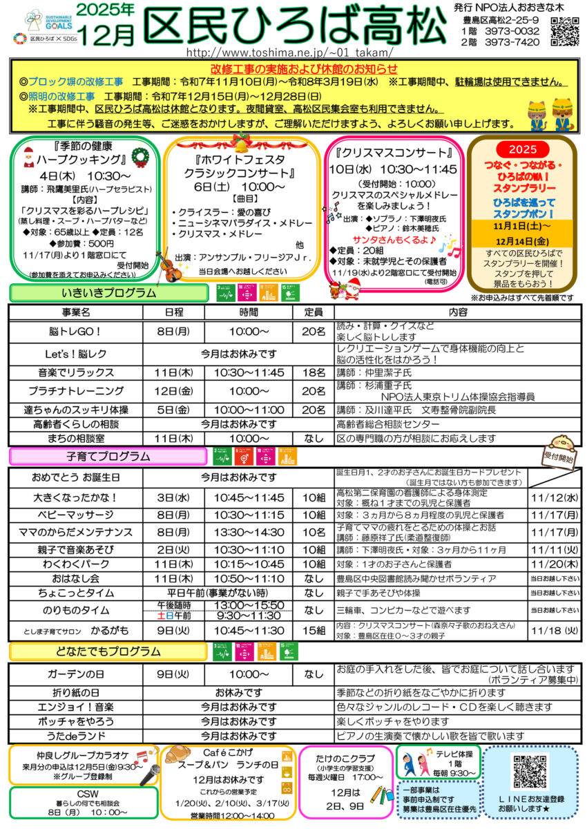 【 12月 】 ■ [要町三丁目町会] 古紙回収 日時:12月21日(日) 9時30分~ 各戸玄関前まで回収に伺います 【 1月 】 ■ 第17回 ふるさと千川どんど焼き 日時:1月11日(日) 10時00分~12時00分 会場:ふるさと千川ひろば 獅子舞ほか伝統芸能、芋のこ汁、おしるこ ■ [要町三丁目町会] 古紙回収 日時:1月25日(日) 9時30分~ 各戸玄関前まで回収に伺います